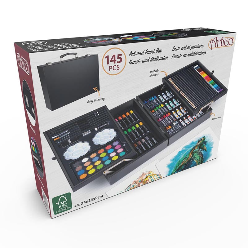 Artico universalus piešimo ir tapybos rinkinys suteikia Jums daugybę priemonių, kad galėtumėte sukurti gražiausius piešinius ir paveikslus. Šį 145 dalių rinkinį sudaro tvirtas medinis dėklas, kuriame rasite spalvotų pieštukų, žymeklių, dažų ir pastelės, įvairių rūšių teptukų, trintukų, drožtuvą ir paletes. Visos priemonės tvarkingai ir aiškiai sudėtos tvirtame juodame dėkle, pagamintame iš FSC sertifikuotos medienos. Piešimo ir tapybos dėklas turi dvi lentynas kiekvienoje pusėje, kurios atsidaro metaliniais vyriais. Taip galėsite tiksliai matyti, kur kas padėta, ir turėsite lengvą bei greitą prieigą prie visko. Rinkinį sudaro: 28 spalvoti pieštukai 2 HB pieštukai 33 akvareliniai žymekliai 24 aliejinės pastelės 24 akvarelės tūbelės (6 ml) 24 akvarelės kasetės 2 plokšti teptukai 2 apvalūs teptukai 2x trintukas 1 drožtukas 2x tapybos paletė
