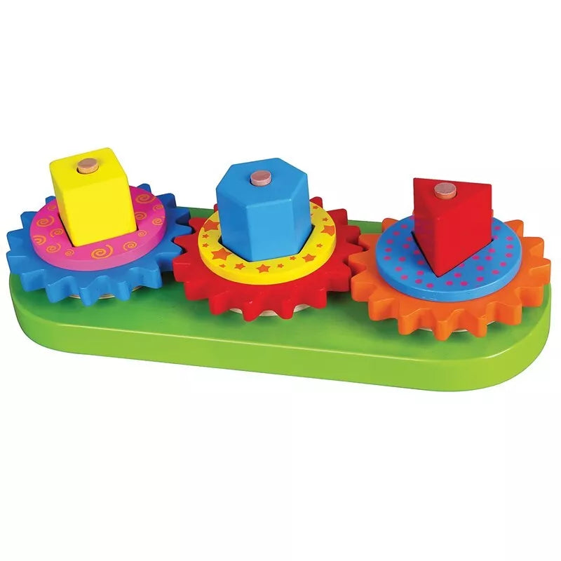 Graži dėlionė su geometriniais blokeliais, žiedais ir dideliais krumpliaračiais. Kai krumpliaračiai susilieja, trys sudėtos dėlionės taip pat gali suktis. Žaidžiant su šia gražia medine dėlionė, lavinami vaikų motoriniai įgūdžiai, spalvų ir formų atpažinimas.